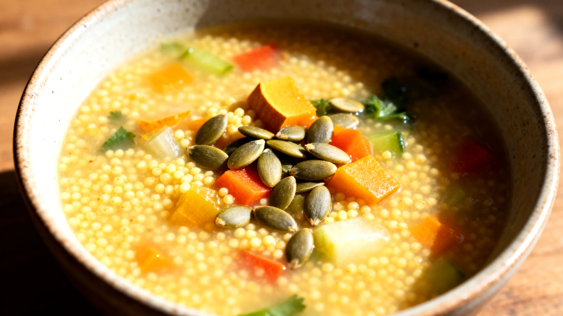 L’indice glicemico basso del miglio, combinato con le fibre delle verdure e i grassi dei semi di zucca, rende questa zuppa ideale per mantenere stabili i livelli di glucosio nel sangue durante la notte. Questo evita quei risvegli notturni legati a cali glicemici che possono compromettere la qualità del sonno e, di conseguenza, il recupero atletico.
